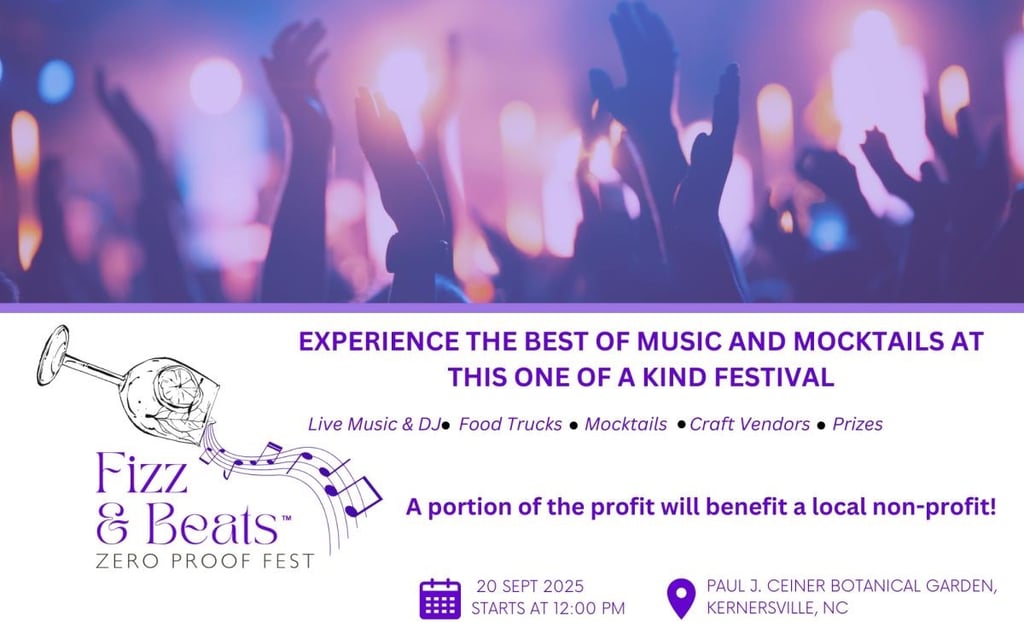 Get ready to experience the 3rd annual Fizz & Beats™️ Zero Proof Fest in the Triad, hosted by Favored Conferences and Events LLC! This one day event will be held at Paul J. Ciener Botanical Gardens in Kernersville, NC, on Saturday, September 20, 2025 from 12:00 - 5:00 pm.